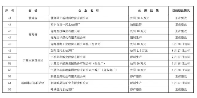 此次“黑榜”名单上有55家企业,比第一季度减少了40家。这些企业分布在河北、山西、内蒙古、辽宁、河南等省份,其中内蒙古自治区就有11家企业。名单上有些企业为再度上榜,比如河北辛集市水处理中心、中国石油天然气股份有限公司大连石化分公司、中冶美利纸业股份有限公司、新疆昕昊达矿业有限责任公司等。以按日计罚方式处罚,江西宏宇能源发展有限公司被罚1060万元,中国石油天然气股份有限公司大连石化分公司、抚顺长顺电力有限公司均已被罚款850万元。
