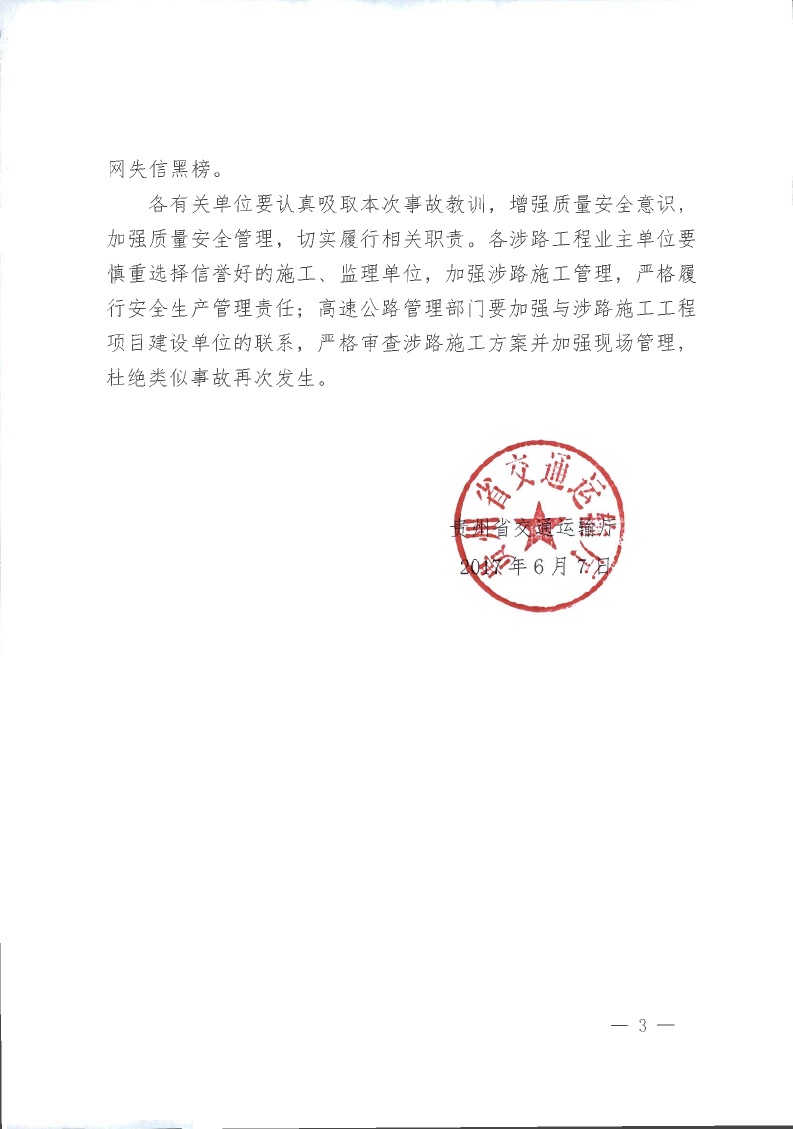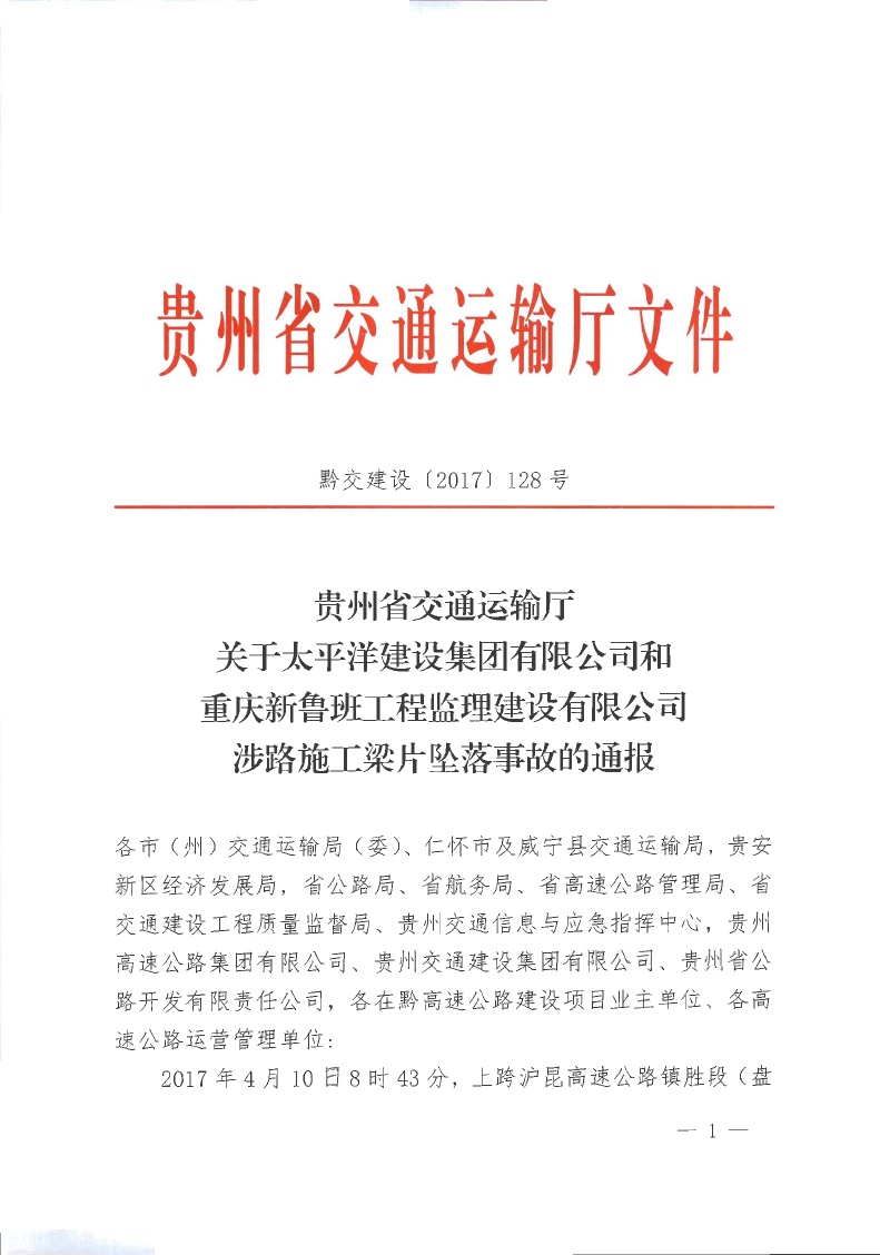 贵州省交通运输厅关于太平洋建设集团有限公司和重庆新鲁班工程监理建设有限公司参建的红果经济开发区南北6号路涉 路工程桥梁施工梁片坠落事故的通报