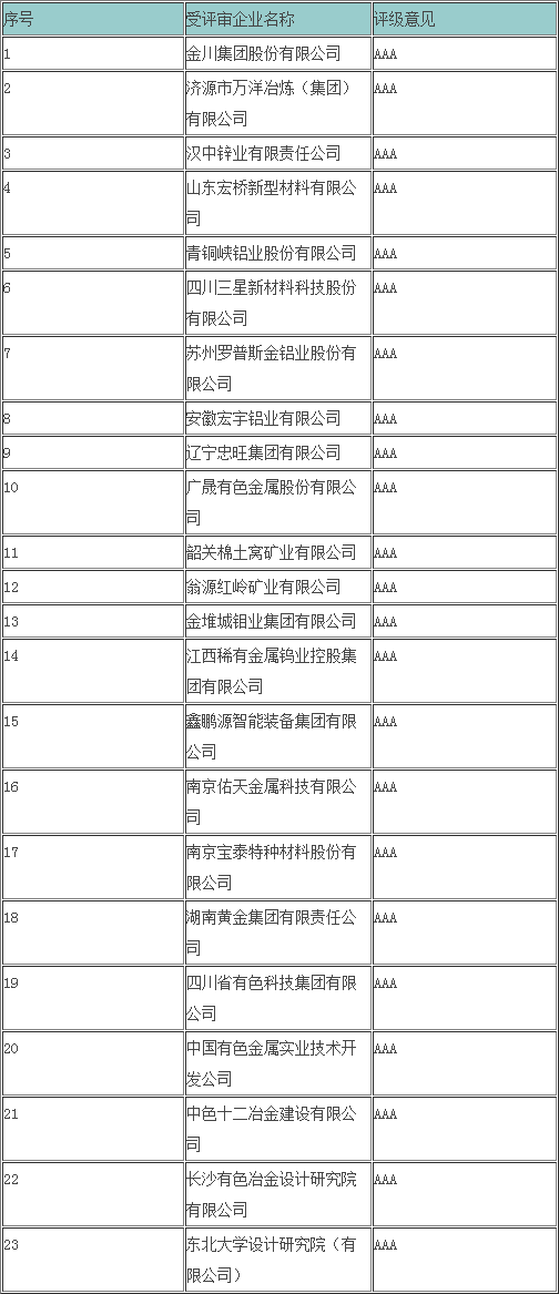 全国有色金属行业企业信用等级评价委员会对信用评价工作办公室上报的专家评价意见和公示结果进行了审定。现将最终评价结果予以公布,并报商务部和国务院国资委备案。信用评价工作办公室将对获评企业建立信用档案,并实时动态跟踪管理 |