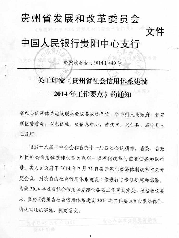 关于印发《贵州省社会信用体系建设2014年工作要点》的通知