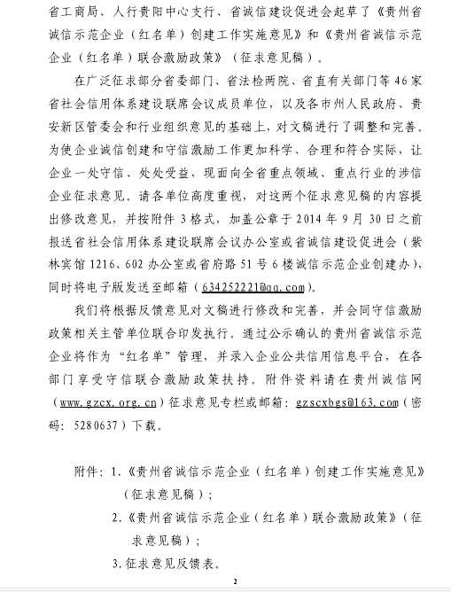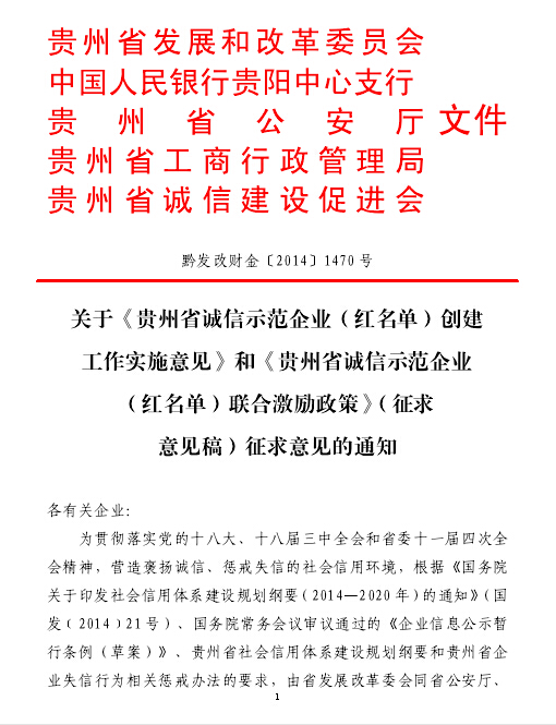 关于《贵州省示范企业(红名单)创建工作实施意见》和《贵州省诚信示范企业(红名单)联合激励政策》(征求意见稿)征求意见的通知