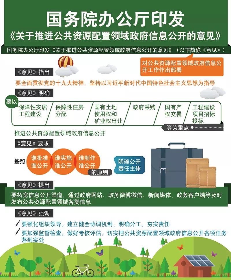 日前,国务院办公厅印发《关于推进公共资源配置领域政府信息公开的意见》(以下简称《意见》),对公共资源配置领域政府信息公开工作作出部署。 《意见》指出,要全面贯彻党的十九大精神,坚持以习近平新时代中国特色社会主义思想为指导,不断推进国家治理体系和治理能力现代化,推进公共资源配置决策、执行、管理、服务、结果公开,扩大公众监督,增强公开实效,努力实现公共资源配置全流程透明化,不断提高公共资源使用效益,维护企业和群众合法权益,为稳增长、促改革、调结构、惠民生、防风险作出贡献,促进经济社会持续健康发展。 《意见》明确,要以保障性安居工程建设、保障性住房分配、国有土地使用权和矿业权出让、政府采购、国有产权交易、工程建设项目招标投标等为重点,推进公共资源配置领域政府信息公开。各地区、各部门要根据区域、行业特点,进一步明确本地区、本行业公共资源配置信息公开范围,细化公开事项、内容、时限、方式、责任主体、监督渠道等,纳入主动公开目录清单。 《意见》要求,按照“谁批准、谁公开,谁实施、谁公开,谁制作、谁公开”的原则,明确公开责任主体。探索建立公共资源配置“黑名单”制度,逐步将骗取公共资源等不良行为的信息纳入“黑名单”并予以公开。 《意见》提出,要拓宽信息公开渠道,通过政府网站、政务微博微信、新闻媒体、政务客户端等及时发布公共资源配置领域各类信息。构建以全国公共资源交易平台为枢纽的公共资源交易数据共享平台体系,推动实现公共资源配置全流程透明化,并实现公共资源配置信息与其他政务信息资源共享衔接。强化公开时效,确定为主动公开的信息,除法律法规另有规定外,要严格按照法定时限予以公开。对于政府信息公开申请,要严格按照法定时限和理由予以答复。 《意见》强调,要强化组织领导,建立健全协调机制,明确分工,夯实责任;要加强监督检查,做好考核评估,切实把公共资源配置领域政府信息公开各项任务落到实处。 【图解】 国务院办公厅印发 《关于推进公共资源配置领域政府信息公开的意见》