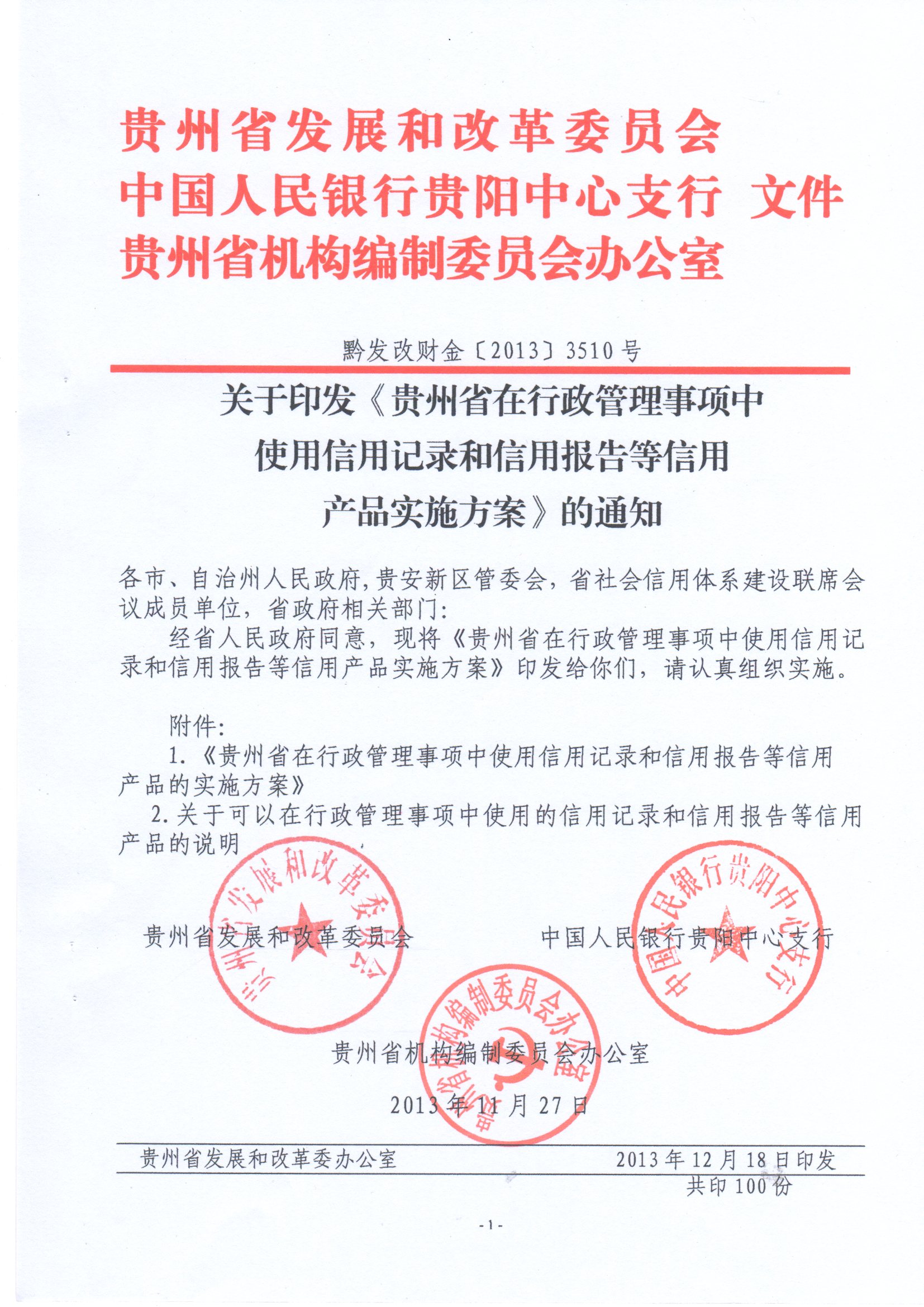 关于印发<<贵州省在行政管理事项中使用信用记录和信用报告等信用产品实施方案>>的通告