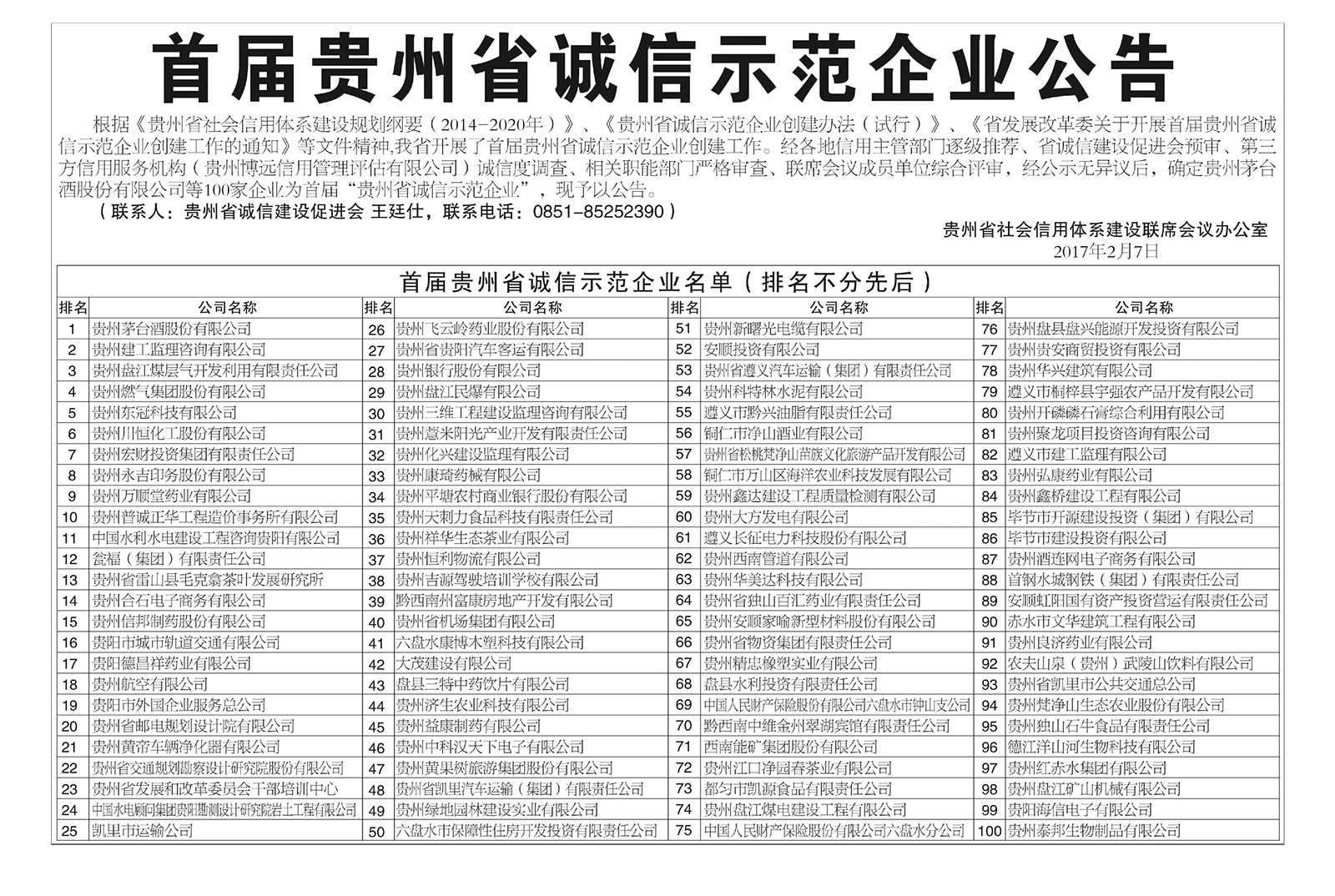 首届贵州省诚信示范企业公告